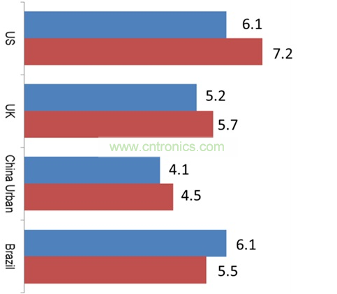 圖一 、北美、 英國、中國城市和巴西在未來一年計劃更換電視的平均壽命 (單位: 年)