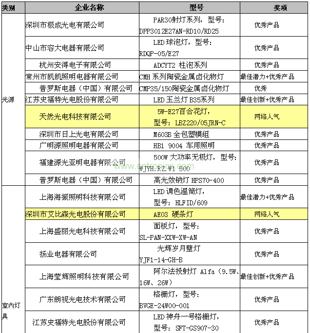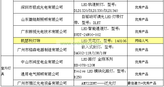 2012年6月9日,2012廣州國際照明展覽會(huì)開幕當(dāng)天,主辦方組織20名終審專家對終審會(huì)議評選出來的獲獎(jiǎng)候選產(chǎn)品進(jìn)行現(xiàn)場的考核評審,最終確定35個(gè)優(yōu)秀產(chǎn)品獎(jiǎng),3個(gè)最佳創(chuàng)新獎(jiǎng)、5個(gè)最佳潛力獎(jiǎng)的獲獎(jiǎng)名單;5個(gè)最佳網(wǎng)絡(luò)人氣獎(jiǎng)是由網(wǎng)友海選出來的名單。