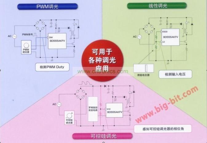 其主要特點是:可進行可控硅/PWM/線性調光。適用于各種調光應用(調光比0.2%-100%);內置緩沖功能,照度變化平穩(可選擇有緩沖、無緩沖);通過LED平均電流控制,可針對輸入電壓、輸入電壓變化,控制相應的LED電流。這種對應可控硅調光的LED照明用驅動IC可用于兼容調光器的燈泡型LED照明、兼容調光器的LED筒燈照明和兼容調光器的LED基礎照明。