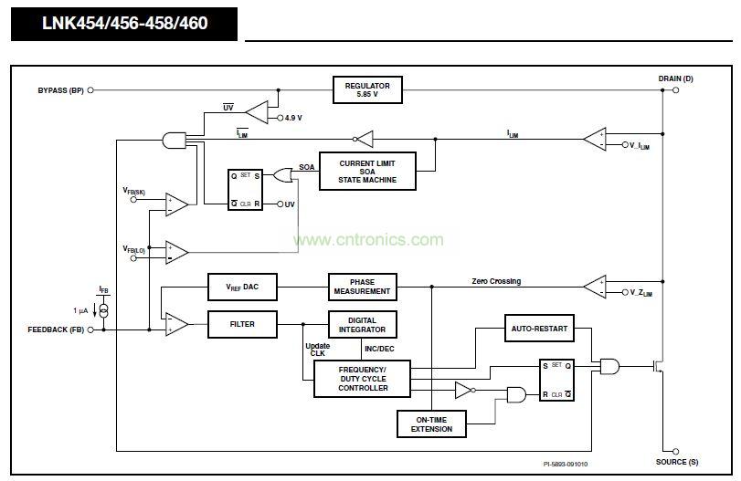 每個器件都在一個單片IC上集成了一個725 V功率MOSFET、一個創(chuàng)新的非連續(xù)模式可變頻率/可變導(dǎo)通時間控制器、頻率抖動、逐周期電流限制及遲滯熱關(guān)斷電路。