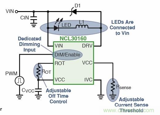 大功率LED可采用安森美半導(dǎo)體的恒流降壓LED驅(qū)動(dòng)器NCL30160,實(shí)現(xiàn)高達(dá)98%的能效。它采用30 mΩ集成MOSFET,100%占空比可提供高能效;輸入電壓范圍為6.3 V至40 V,開關(guān)頻率可達(dá)1.4 MHz;還具有專用PWM調(diào)光引腳/低功率關(guān)閉、無須控制環(huán)路補(bǔ)償和1.5 A平均電流能力。