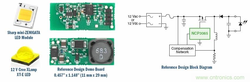 對(duì)于3至4個(gè)LED模塊的12 V AC-DC設(shè)計(jì),可以使用安森美半導(dǎo)體針對(duì)NCP3065的評(píng)估板NCP3065BBGEVB,用來驅(qū)動(dòng)12 Vac/Vdc應(yīng)用中的夏普Z(yǔ)ENIGATA™、Cree XLamp™MC-E及其他LED模塊。其特點(diǎn)是小尺寸、寬輸入和輸出工作電壓,輸出電流經(jīng)過穩(wěn)流,還具有LED開路保護(hù)、輸出短路保護(hù)能力。該解決方案適用于MR16燈泡、景觀照明、交通照明。