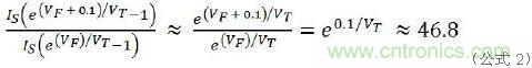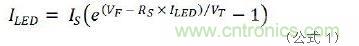 下面是圖1a行不通的原因所在。在公式1中,IS、RS是常數(shù),取決于LED產品本身,與VT是熱電壓無關。假設串聯(lián)電阻RS是理想值零,那么僅0.1V的VF變化就會產生47倍的ILED差異。