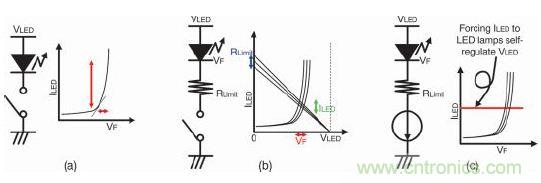 現(xiàn)在我們來看看圖1b。添加一個限流電阻器RLIMIT來保護LED燈。由于有限流電阻器,因此該燈不會被燒壞。在視頻顯示器應用領域,這種方法在控制LED光強度方面仍然不夠好。LED曲線和RLIMIT產生的負載曲線可決定其LED電流值。如紅色或藍色標記所示,該LED和電阻器分別存在制造誤差造成的正向電壓變化及電阻變化。這些誤差因素會使LED電流(綠)產生不可忽視的變化。