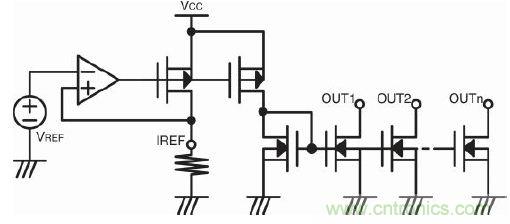 此外,我們都知道集成電路(IC)可提供良好的匹配電路對。這也是選擇恒流法的另一個優(yōu)勢。圖2是LED驅動器的基本輸出級結構。市場上很多LED驅動器IC都有參考電流設置端 IREF,該參考電流是鏡像到其輸出端的恒流。