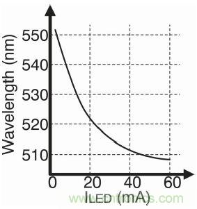 這時候,需要考慮電流變化對LED光輸出波長值的影響。改變波長就意味著改變人眼看到的色彩。圖4是綠色LED燈的實例。通常在業(yè)界,510nm 廣泛代表綠色。因此,大部分LED燈制造商所設計的LED燈產品在最大額定電流下都具備510nm的波長。在圖4中,隨著LED電流的升高,波長可達到510nm。獲得綠色的最佳方法是盡量使燈的驅動電流接近最大額定值。這也就說明了為什么使用數(shù)字控制比使用模擬控制好。