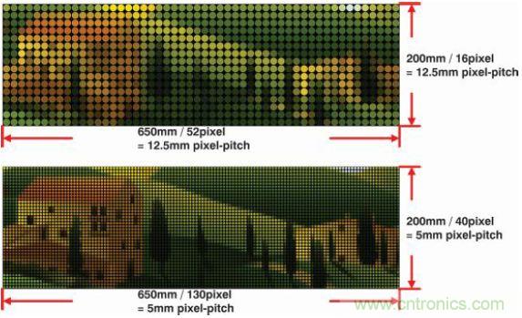 例如,5m視距的系統(tǒng)需要5mm像素間距來實現(xiàn)良好分辨率。另一個視覺實例如圖7所示,圖中展示了過低像素間距如何降低輸出影像質量。像素間距為12.5mm 的影像(上)看起來很粗糙,無法近距離辨識。但保持一定的距離觀看時影像開始變得清晰,與觀看像素間距為5mm的影像(下)類似。這個實例清楚地說明了視距與像素間距的關系。