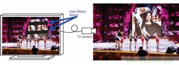 老式模擬電視通常在一秒鐘內顯示24張不同的靜態(tài)影像,幀速率為24。當模擬電視攝像機拍攝另一個模擬電視屏幕時,可產生由視頻影像與黑色條帶構成的斑馬紋混合畫面(圖9)。這種現(xiàn)象由同步電視攝像機和電視屏幕掃描率引起。在拍攝LED屏幕的攝像機采用時分復用陽極驅動器時,也會出現(xiàn)相同的問題。應用實例包括使用電視攝像機拍攝背景墻壁上由LED顯示器放大演員的舞臺影像或者用電視攝像機拍攝體育場中體育賽事比分牌或標牌等。要避免這個問題,LED顯示器現(xiàn)在需要比攝像機系統(tǒng)運行得更快,特別是在專用LED顯示器市場。