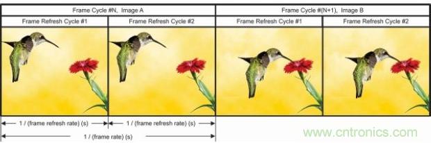 為滿足更快運行這一要求,很多LED顯示系統(tǒng)都在一個幀周期內反復顯示相同的影像,稱為幀刷新率。圖10是幀速率與刷新率的關系。只有兩張幀影像:A 和 B。每個幀重復“影像 x”兩次。因而本實例“幀刷新率”= 2 ד幀速率”。