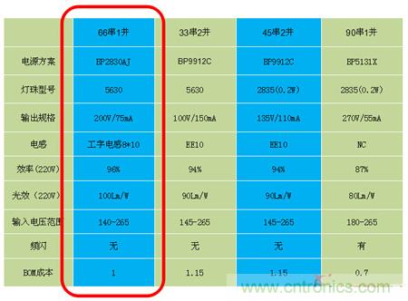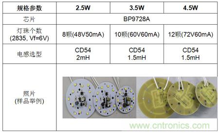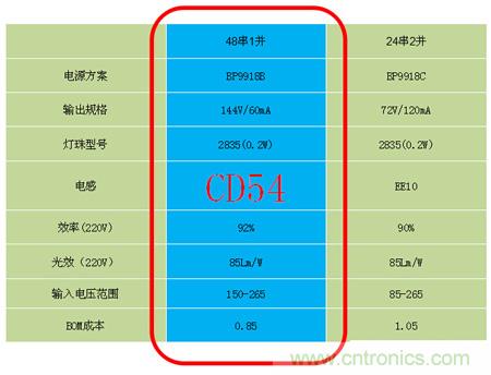 從上圖各種參數對比我們可以看出,單從成本來看,一定是線性方案最低,但同時會存在一些問題,比如光效,效率并不是很理想,最關鍵的一點,線性方案溫度較高,因為鋁基板溫度高而造成的硫化而存在一定的風險。所以,從整體參數對比來看,66串1并的方案是性價比最高的。同理,8W T管方案推薦的是單串1并BP9918B的方案,單片集成工藝,集成啟動電阻,極簡的外圍電路,系統成本極具競爭力,其中值的一提的是該方案采用了CD54電感,可將BOM成本可以做到大概在0.85左右,且可以實現全貼片的方案,從而幫助客戶降低人工成本。