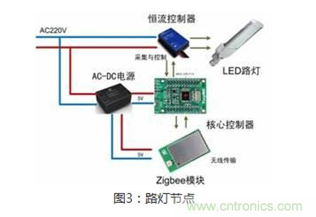這是我們的一級終端,每個路燈節點由ZigBee無線模塊、核心控制板、光線及人流傳感器和LED燈組成。每個節點通過ZigBee接收命令,并實時匯報每盞路燈的亮、滅情況、實現亮度調節、傳送電能負荷狀態、完成燈桿損壞報警與漏電報警、接收來自ZigBee集中器的查詢命令、控制命令等。