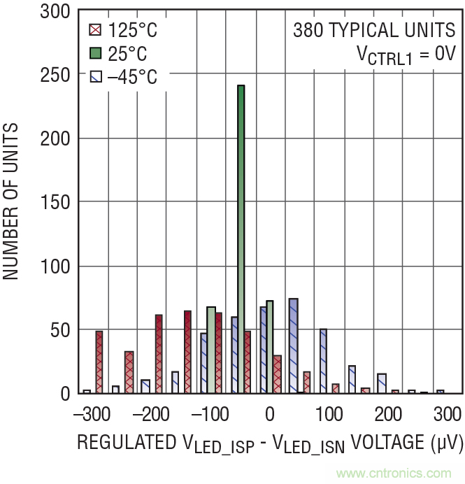 圖 1:VCTRL = 0V 時,LT3744 中的 LED 電流調節(jié)放大器之典型失調電壓為 ±300µV