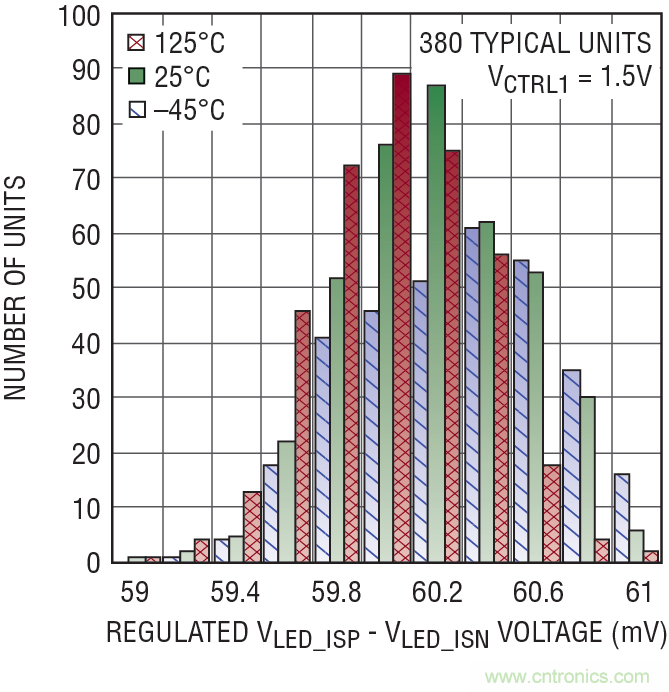 圖 1 顯示了當模擬控制輸入為 0V 時,隨溫度變化 LT3744 失調電壓的生產(chǎn)一致性,在這里,典型器件數(shù)量為 380 個。憑借誤差放大器的低失調,控制環(huán)路在 1/20 標度模擬調光時,能夠實現(xiàn) ±10% 的典型準確度。圖 2 顯示了當控制輸入等于 1.5V 時,穩(wěn)定電壓在多個 LED 電流檢測引腳上的分布。滿標度范圍的準確度好于 ±3%,這相當于在 60mV 滿標度調節(jié)電壓時準確度為 ±1.8mV。