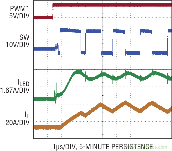 圖 3 顯示了用 12V 電源向紅光 LED 提供 20A 電流時,在 5 分鐘時間內 LED 電流的恢復情況。開關頻率為 550kHz,電感器為 1µH,PWM 調光頻率為 100Hz,接通時間為 10µs (1000:1 調光比)。圖中顯示了大約 3 萬個調光周期,在開關波形中無抖動,每個恢復開關周期都是相同的。