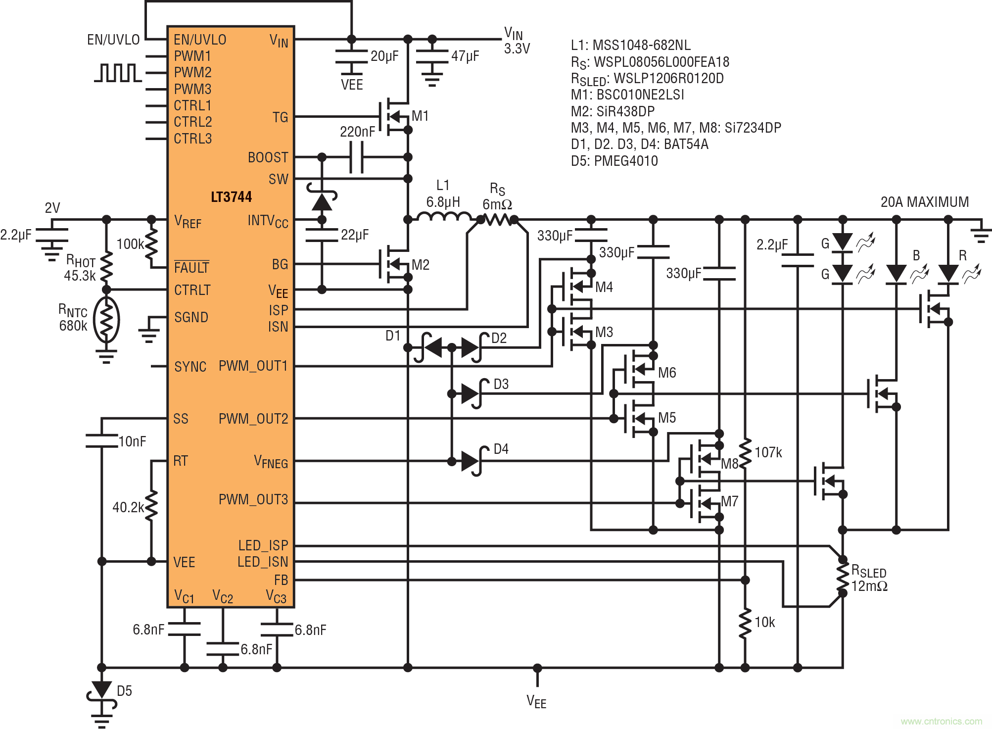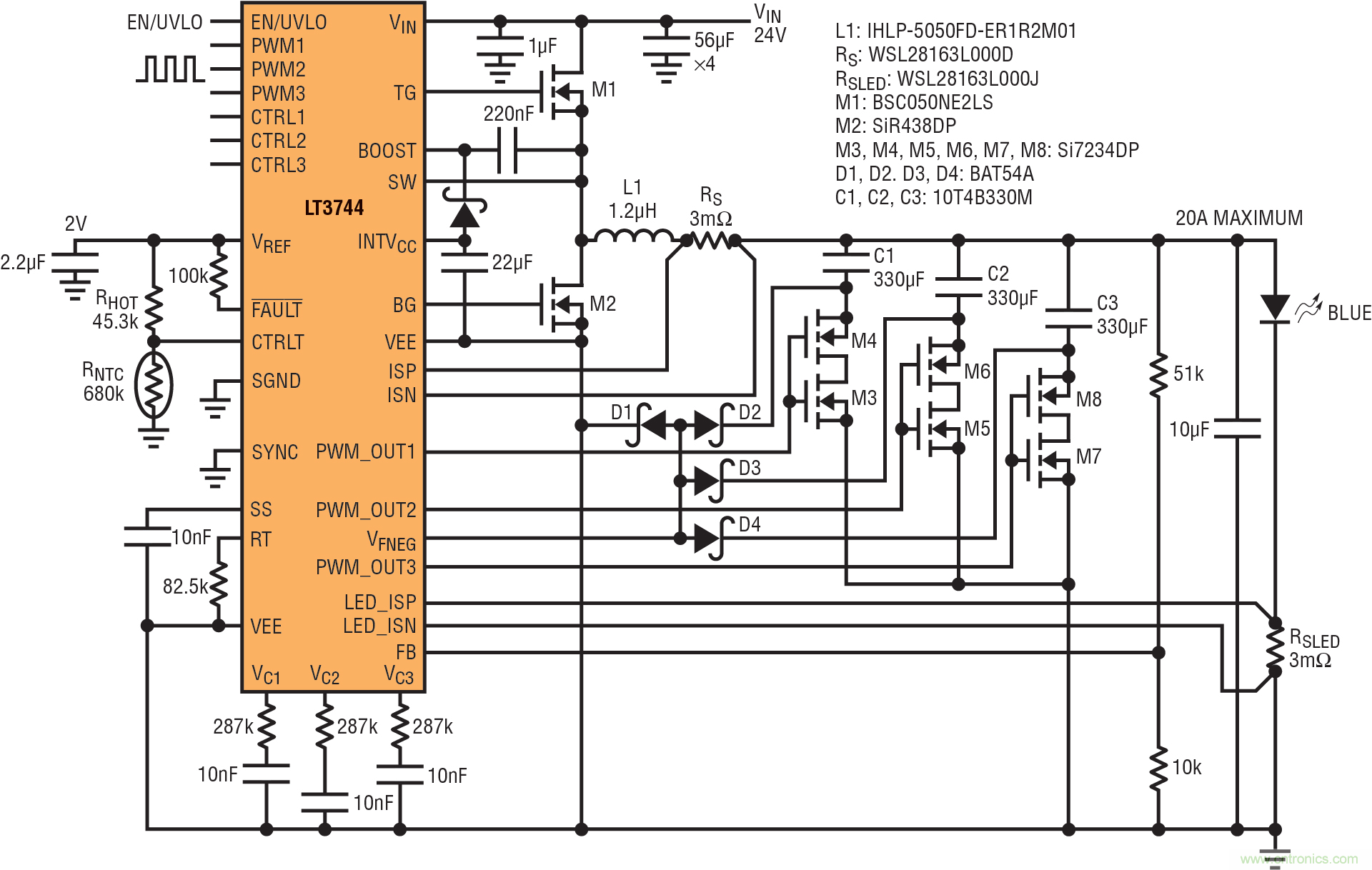 圖 14:并聯(lián)負輸出應用向連接到系統(tǒng)外殼的公共陽極 LED 提供 120W 功率。