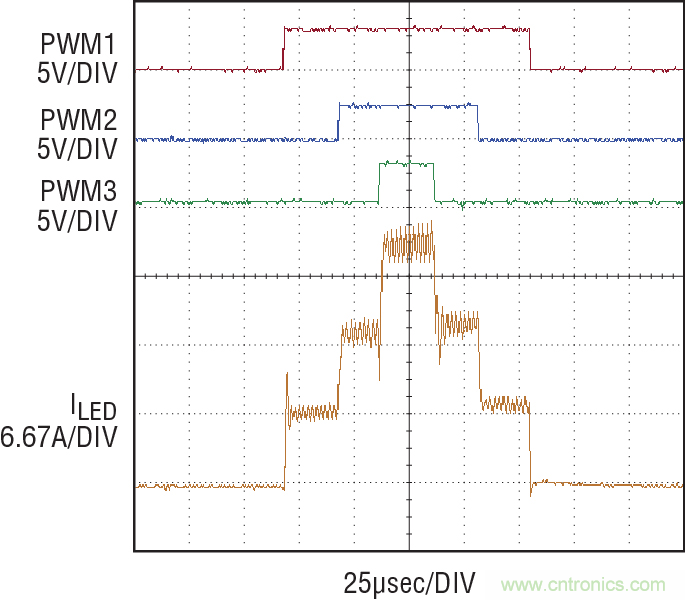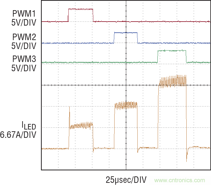 圖 5:LT3744 在 3 種穩(wěn)定電流狀態(tài)之間轉換,斷開時間不到 3 個開關周期。