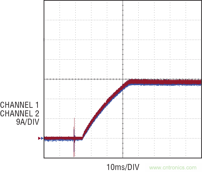圖 8 顯示了一款 324W 轉換器,由兩個ADI DC2339A 演示電路板并聯(lián)組成。在這款設計中,每個并聯(lián)的控制器都產(chǎn)生 27A 電流,總共產(chǎn)生 54A 電流,電壓為 6V。通過將相應的補償輸出連接到一起,兩個控制器協(xié)調一致地運行,以提供平滑、良好的啟動和準確的 DC 調節(jié)。