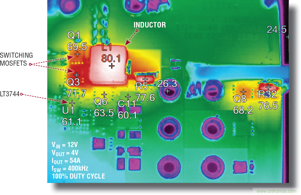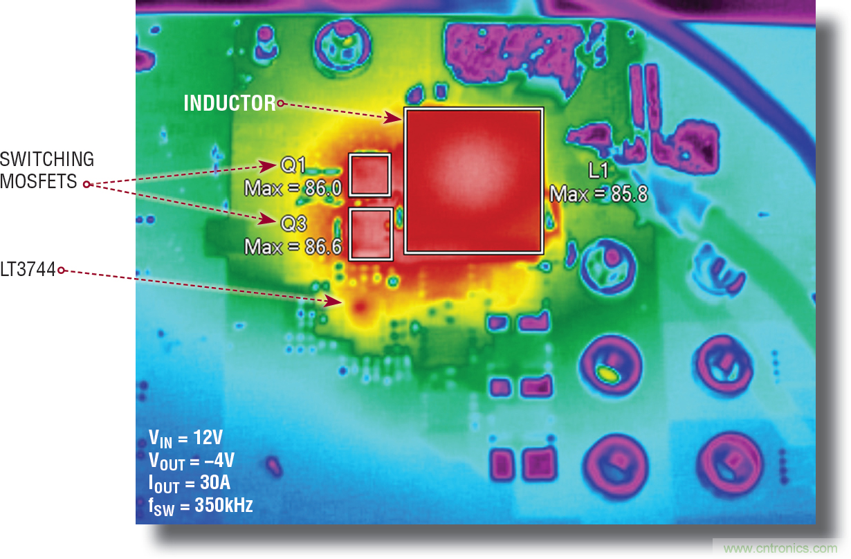 圖 15 顯示,向并聯(lián)負輸出降壓-升壓型應用中的 LED 提供 30A 電流時,組件溫度的上升情況。