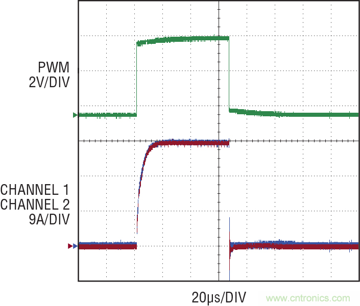 在這個應用中,可以對兩個獨立的 LED 串在 54A 滿電流時進行 PWM 調光。進行 PWM 調光時,圖 12 顯示,LED 電流在兩個驅動器之間是完全地均分的。在這個測試中,LED 電流從 0A 到 54A 的上升時間為 6.6µs。從每個驅動器輸出到 LED 的電氣連接必須仔細平衡,以避免在任一通路中增加電感,這會縮短有效上升時間。