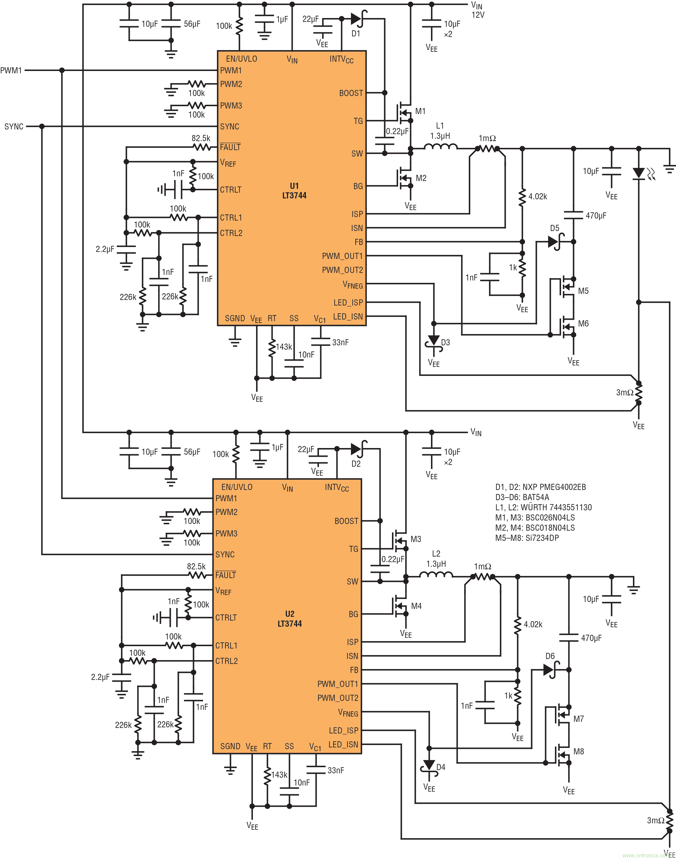 兩個 LT3744 LED 驅動器并聯(lián)以組成 324W 雙 LED 驅動器