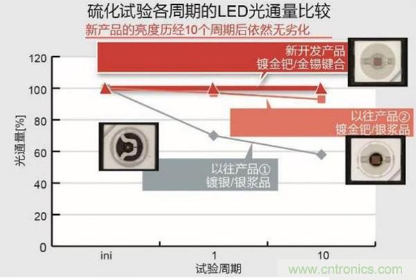 在硫化試驗中,以往使用鍍銀框架及銀漿的產(chǎn)品的光通量在一個周期(24小時)后為70%,10個周期后為60%,時間越長其光通量越低;而新產(chǎn)品可在10個循環(huán)(240小時)后依然保持幾乎100%的高光通量 。