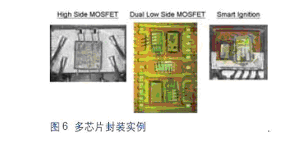 圖6所示為目前車(chē)載系統(tǒng)中采用多芯片封裝的幾個(gè)實(shí)例。這些智能化器件可以提供更高的系統(tǒng)性能監(jiān)控能力,通過(guò)集成保護(hù)功能提高功率系統(tǒng)的可靠性。如過(guò)流、過(guò)壓和過(guò)熱保護(hù)等功能都是這類(lèi)產(chǎn)品的標(biāo)配。當(dāng)器件感測(cè)到有可能發(fā)生上述異常狀況時(shí),能夠把功率MOSFET置于自我保護(hù)整個(gè)系統(tǒng)的環(huán)境中。此外,這些器件還集成有附加診斷功能,用以監(jiān)控負(fù)載開(kāi)路或短路,有助于指導(dǎo)汽車(chē)機(jī)械裝置隔離和糾正車(chē)輛中出現(xiàn)的問(wèn)題。