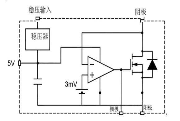 實(shí)現(xiàn)與兩端整流器功能相當(dāng)?shù)钠骷仨毎ㄒ粋€MOSFET,一個控制該器件以及內(nèi)部偏置電源的非常快速且非常敏感的電路。這樣的電路如圖1所示。