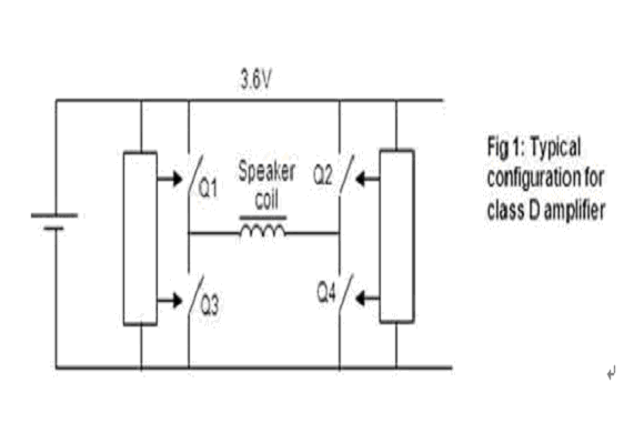 目前的移動(dòng)電話通常使用D類音頻放大器。這些放大器在一個(gè)H橋電路中采用了兩對(duì)FET來控制揚(yáng)聲器線圈。配置如圖1所示。Q1&Q4導(dǎo)通和Q2&Q3關(guān)斷時(shí)向一個(gè)方向驅(qū)動(dòng)揚(yáng)聲器線圈,Q1&Q4關(guān)斷和Q2&Q3導(dǎo)通