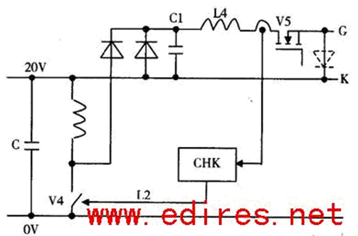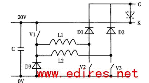 硬驅動關斷如圖4所示電路,當將V6 開通時,電容C 對門極反向放電,將IGCT關斷。由于電路的極低電感(5 到15nH 取決于IGCT 的型號)和大電容器組,IGCT對門2陰極端的電磁噪音不敏感。與IGCT相比較,傳統的GTO驅動裝置大約有200 nH的電感和更小的電容器組。