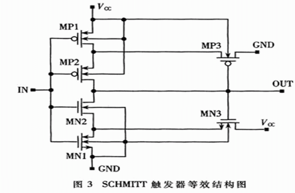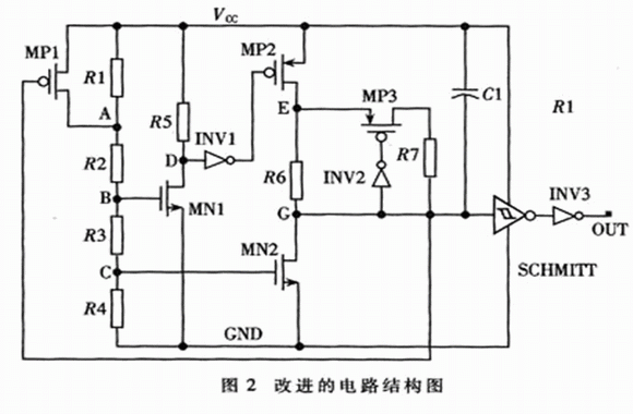 改進(jìn)的電路如圖2所示,電路結(jié)構(gòu)由采樣、先導(dǎo)控制、比較器、遲滯反饋回路、加速響應(yīng)電路、緩沖器六部分構(gòu)成。電阻R1、R2、R3、R4構(gòu)成分壓電阻網(wǎng)絡(luò)實現(xiàn)對Vcc的采樣;MNl、R5、INVl組成先導(dǎo)控制電路,實現(xiàn)對比較器灌電流的控制;MN2、R6、MP2組成比較器,實現(xiàn)采樣電壓與MN2的VTH比較;MP1構(gòu)成正反饋回路,可實現(xiàn)Vcc的遲滯功能;INV2、MP3、R7構(gòu)成正反饋回路,可加速比較器的翻轉(zhuǎn),從而提高電路的響應(yīng)速度;SCHMITT觸發(fā)器和INV3是緩沖電路,對比較器的輸出波形進(jìn)行緩沖和整形,SCHMITT觸發(fā)器的結(jié)構(gòu)如圖3所示,其工作原理詳見參考文獻(xiàn)[3];另外,電容C1起濾波和儲能作用。
