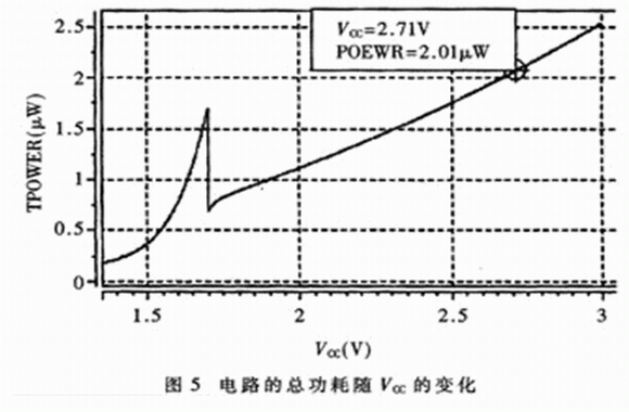 從圖5的仿真波形中可以看出:當(dāng)Vcc的電壓正常時,電路的總功耗隨著Vcc的升高而增大,當(dāng)Vcc=2.7V時,總功耗約為2μW,可見電路的靜態(tài)功耗很低。