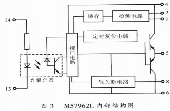M57962AL是一種14腳單列直捕式結(jié)構(gòu)的厚膜驅(qū)動模塊,其內(nèi)部結(jié)構(gòu)圖如圖3所示。它由光耦合器、接口電路、檢測電路、定時復(fù)位電路以及門關(guān)斷電路組成,驅(qū)動功率大,町以驅(qū)動600A/600V及400A/l200V等系列IGBT模塊。