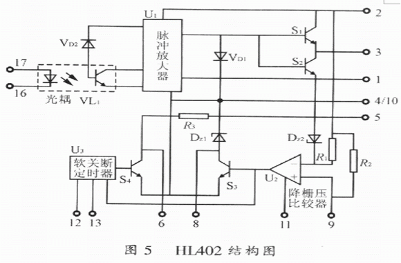 HL402結(jié)構(gòu)圖如圖5所示。圖5中,VL1為帶靜電屏蔽的光耦合器,它用來實(shí)現(xiàn)與輸入信號的隔離。由于它具有靜電屏蔽,因而顯著提高了HL402抗共模干擾的能力。圖5中U1為脈沖放大器,S1、S2實(shí)現(xiàn)驅(qū)動脈沖功率放大,U2為降柵壓比較器,正常情況下由于腳9輸入的IGBT集電極電壓VCE不高于U2的基準(zhǔn)電壓VREF,U2不翻轉(zhuǎn),S3不導(dǎo)通,故從腳17和腳16輸入的驅(qū)動脈沖信號經(jīng)S2整形后不被封鎖。該驅(qū)動脈沖經(jīng)S2、S2放大后提供給IGBT使其導(dǎo)通或關(guān)斷,一旦IGBT退飽和,則腳9輸入集電極電壓給IGBT使其導(dǎo)通或關(guān)斷,并且腳9輸入的集電極電壓采樣信號VCE高于U2的基準(zhǔn)電壓VREF,比較器U2翻轉(zhuǎn)輸出高電平,使S3導(dǎo)通,由穩(wěn)壓管DZ2將驅(qū)動器輸出的柵極電壓VGE降低到10V。此時,軟關(guān)斷定時器U3在降柵壓比較器U2翻轉(zhuǎn)達(dá)到設(shè)定的時間后,輸出正電壓使S4導(dǎo)通,將柵極電壓軟關(guān)斷降到IGBT的柵射極門限電壓,給IGBT提供一個負(fù)的驅(qū)動電壓,保證IGBT可靠關(guān)斷。