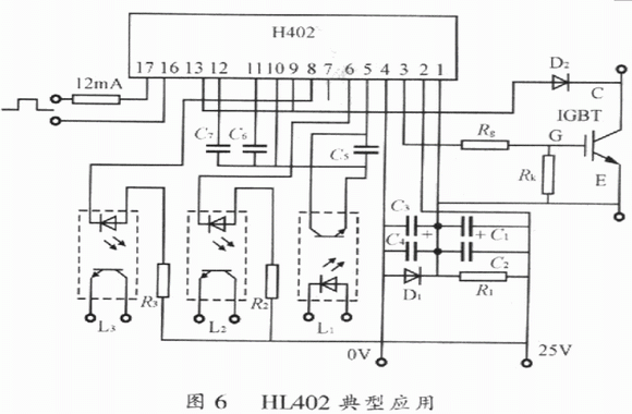 HL402是17腳單列直插式結(jié)構(gòu),內(nèi)置有靜電屏蔽層的高速光耦合器實(shí)現(xiàn)信號隔離,抗干擾能力強(qiáng),響應(yīng)速度快,隔離電壓高。它具有對IGBT進(jìn)行降柵壓、軟關(guān)斷雙重保護(hù)功能,在軟關(guān)斷及降柵壓的同時能輸出報警信號,實(shí)現(xiàn)封鎖脈沖或分?jǐn)嘀骰芈返谋Wo(hù)。它輸出驅(qū)動電壓幅值高,正向驅(qū)動電壓可達(dá)15~17V,負(fù)向偏置電壓可達(dá)10~12V,因而可用來直接驅(qū)動容量為400A/600V及300A/1200V以下的IGBT。