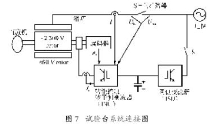 上海南洋電機廠采用ACS800-67 變頻器構建雙饋風力發電機的實驗平臺,風力機采用直流電動機模擬,即雙饋發電機轉子靠直流電動機拖動。系統連接示意圖如圖7所示。技術數據如下:發電機定子額定電壓690 V,定子額定電流1500A,額定頻率50 Hz,額定功率1 345kW,額定轉速1 513 r/min,同步轉速1 500 r/min,功率因數0.9,轉子開路電壓1990V,轉子電流550A;變頻器型號ACS800-67-0480/0770-7,調速范圍±30%。