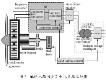 PMDD的特點是沒有升速齒輪箱,葉輪直接驅動低速發電機轉子,消除了DFIG 的薄弱環節,大大提高可靠性,降低維護工作量。由于發電機定子繞組不直接與電網相連,而是通過變頻器連接,因此電機額定轉速可以降低,使電機極數減少至合理值。缺點是低速電機體積大,定子繞組絕緣等級要求高,變頻器要輸送發電機全功率,因此電機和變頻器的價格都比DFIG高。