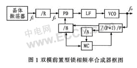 圖1中,(P+1)/P為高速雙模前置分頻器,分頻模數為P+1和P;A為吞脈沖可編程計數器;B為主可編程計數器;MC為模控制邏輯電路。其分頻比為N=(P+1)A+P(B-A)=PB+A (1)