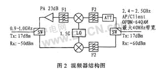 高性能的本振信號是影響混頻器輸出頻譜純度的主要因素。利用鎖相環頻率合成技術設計的本振源能為混頻電路提供性能良好的本振載波。在WLAN中,混頻器需將來自AP的2.4 GHz的信號下變換到950 MHz,以使信號能在特定的電纜上傳輸。混頻器結構圖如圖2所示。ADF4360-4產生1.5 GHz的本地振蕩器(LO),混頻器采用AD8343,F1為900 MHz~1000 MHz的帶通濾波器。F2為24 GHz~2.5 GHz的帶通濾波器。PA的信號功率較大,超過AD8343門限,必須衰減,ATT為衰減網絡。