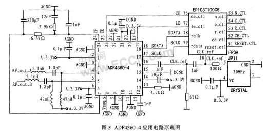 圖3是利用ADF460-4作為混頻器本振的外圍電路。外部晶體振蕩器為20 MHz,具有高穩定性。該晶體振蕩器不僅為ADF4360-4提供參考頻率,還為控制ADF4360-4的FPGA器件提供時鐘。晶體振蕩器接ADF4360-4的參考時鐘輸入引腳CLK_ref,在內部電荷泵輸出引腳CP和VCO輸出引腳VTUNE之間接入環路濾波電路。