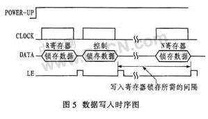 數據寫入時序:DATA在每個CLOCK的上升沿從MSB(最高有效位)開始依次寫入24位移位寄存器中的數據并一次鎖存到目標寄存器,再開始下一個目標寄存器的初始化。目標寄存器選取由移位寄存器中的DB1、DB0決定。對寄存器賦值順序為R,C、N。C寄存器和N寄存器賦值間隔應大于5 ms,數據寫入時序如圖5所示。