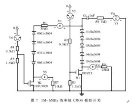 對約束VDD≥Vin≥VSS作深入分析可知,Vin之所以取值有限,根本原因在于其與V柵-襯底的關聯。使V柵-襯底獨立,避免Vin、Vout的影響,反過來將讓Vin輕松擺脫束縛。為此,本節設計了接地形CMOS傳輸門。原理電路如圖6(b)所示,具體的1M~6MHz高頻、功率級模擬開關電路見圖7。
