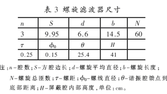 調頻范圍1.5M~3MHz;通帶中心插耗A0≤3dB;25dB帶寬△f25dB≥25kHz; 終端負載RS=RL=50Ω;傳輸功率P=100W。采用等元型螺旋濾波器設計法[6]確定的方腔螺旋腔濾波器腔數及尺寸見表3,測試結果見圖9、10及表4。