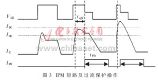 ,大多數IPM采用兩級關斷模式,過流保護和短路保護操作可參見圖3。其中,VG為內部門極驅動電壓,ISC為短路電流值,IOC為過流電流值,IC為集電極電流,IFO為故障輸出電流。
