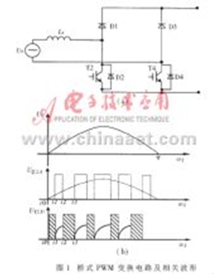 圖1(a)所示為工作在PWM整流狀態(tài)的H型橋式PWM變換電路(此圖為正弦波正半波輸入下的等效電路,上半橋的兩只IGBT未畫(huà)出),圖1(b)為下半橋兩只大功率器件的驅(qū)動(dòng)信號(hào)和相關(guān)的器件波形。現(xiàn)以正半波工作過(guò)程為例進(jìn)行分析(對(duì)于三相PWM電路,在整流、逆變工作狀態(tài)或單相DC/DC工作狀態(tài)下,PWM電路的分析過(guò)程及結(jié)論基本類(lèi)似)。