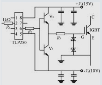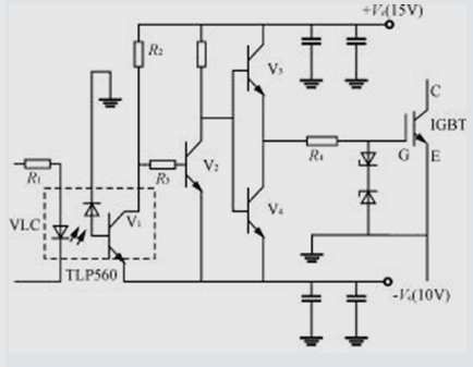 圖3為采用光耦合器等分立元器件構(gòu)成的IGBT驅(qū)動電路。當(dāng)輸入控制信號時,光耦VLC導(dǎo)通,晶體管V2截止,V3導(dǎo)通輸出+15V驅(qū)動電壓。當(dāng)輸入控制信號為零時,VLC截止,V2、V4導(dǎo)通,輸出-10V電壓。+15V和-10V電源需靠近驅(qū)動電路,驅(qū)動電路輸出端及電源地端至IGBT柵極和發(fā)射極的引線應(yīng)采用雙絞線,長度最好不超過0.5m。