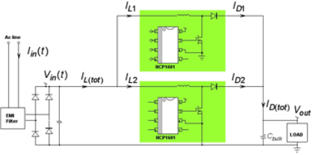 而在PFC方面,采用安森美半導體的NCP1606和NCP1654等PFC控制器,已經可以將液晶電視厚度降到較低;為了支持低至10 mm的極纖薄設計,可以采用兩顆相對較小的NCP1601芯片,用交錯式架構來來實現,如圖3所示。交錯式PFC是在原來放置單個較大PFC的地方并行放置兩個功率為一半的較小PFC。這兩個較小PFC以180°的相移交替工作,在輸入端或輸出端累加時,它們可以抵消每相電流紋波的主要部分。