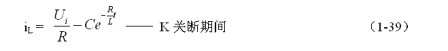 式中C為常數,把初始條件代入上式,就很容易求出C,由于控制開關K由接通狀態突然轉為關斷時,流過儲能電感L中的電流iL不能突變,因此,i(Ton+)正好等于流過儲能電感L的最大電流ILm ,所以(1-39)式可以寫為: