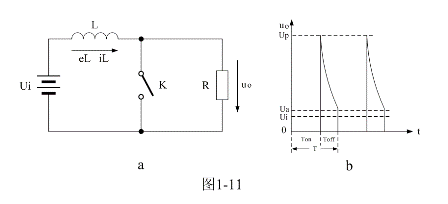 式中Ton為控制開關K接通的時間。當圖1-11-a中的控制開關K由接通狀態突然轉為關斷時,儲能電感L會把其存儲的能量(磁能)通過反電動勢進行釋放,儲能電感L產生的反電動勢為: