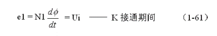 圖1-16-a中,在Ton期間,控制開關K接通,輸入電源Ui開始對變壓器初級線圈N1繞組加電,電流從變壓器初級線圈N1繞組的兩端經過,通過電磁感應會在變壓器的鐵心中產生磁場,并產生磁力線;同時,在初級線圈N1繞組的兩端要產生自感電動勢E1,在次級線圈N2繞組的兩端也會產生感應電動勢e2;感應電動勢e2作用于負載R的兩端,從而產生負載電流。因此,在初、次級電流的共同作用下,在變壓器的鐵心中會產生一個由流過變壓器初、次級線圈電流產生的合成磁場,這個磁場的大小可用磁力線通量(簡稱磁通量),即磁力線的數目 來表示。
