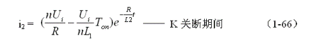 式中C為常數,把初始條件代入上式,就很容易求出C,由于控制開關K由接通狀態突然轉為關斷時,變壓器初級線圈回路中的電流突然為0,而變壓器鐵心中的磁通量 不能突變,因此,變壓器次級線圈回路中的電流i2一定正好等于控制開關K接通期間的電流i2(Ton+),與變壓器初級線圈回路中勵磁電流被折算到變壓器次級線圈回路電流之和。所以(1-65)式可以寫為: